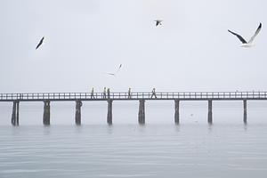 Shipyard workers walk across a dock in the Skeleton coast of Namibia